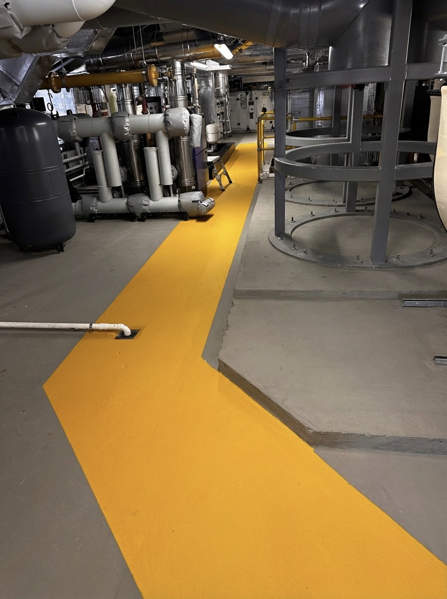 Our works consisted of painted walls and ceiling bulkheads finished in Dulux Diamond Matt, together with the coating of the plant room floor and the setting out and stencilling of emergency exit signs and pathways using luminescent paints.